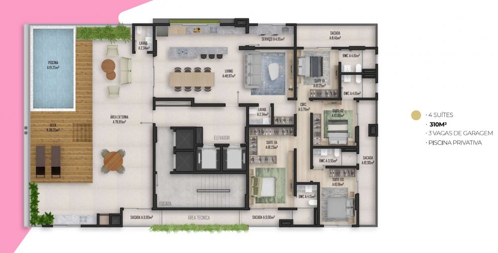 - **Piscina e Espelho D'água**: Relaxe e se refresque em grande estilo.