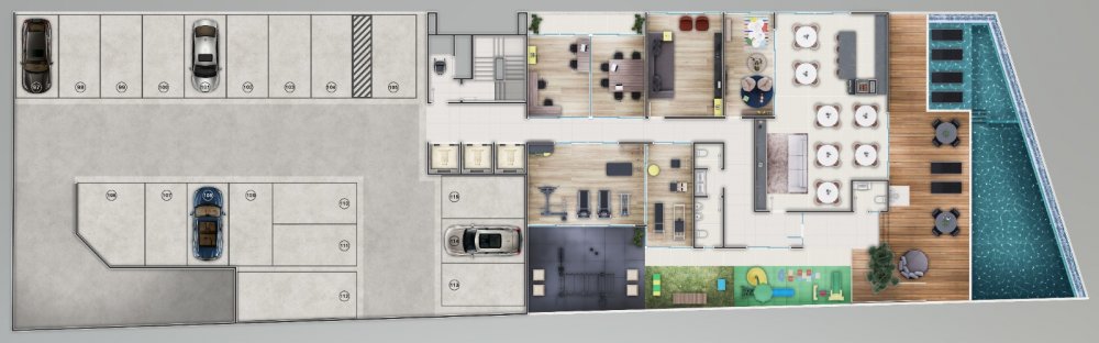 Vaga de garagem privativa e coberta, com design moderno e som ambiente.