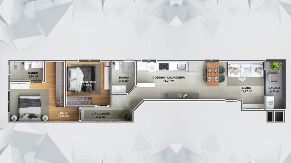 - Piso porcelanato nas áreas molhadas e comum, e piso Vinílico nos quartos.