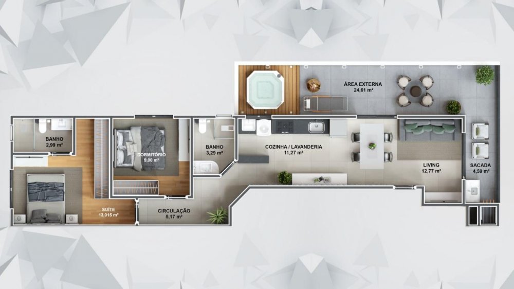 - Área privativa a partir de 71,33 m² e área total a partir de 112,88 m².