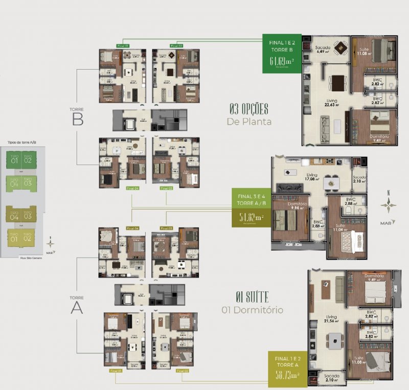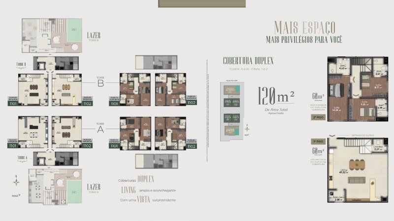 Com unidades a partir de 54,82 m² de área privativa e um total de 104,66 m², você terá espaço para viver e relaxar.