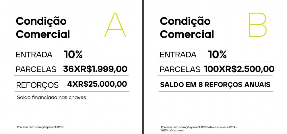 - Parcelamento com a construtora entrada de 1ª opção = 10% + 36 parcelas mensais + 4 reforços semestrais, 2ª opção = 10% de entrada + 100 parcelas mensais + 8 reforços anuais (havendo saldo pode ser financiado via banco)