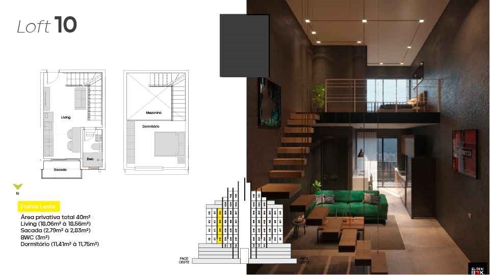 * Loft 40 m² - Dormitório no mezanino, Living integrado, banheiro e sacada.